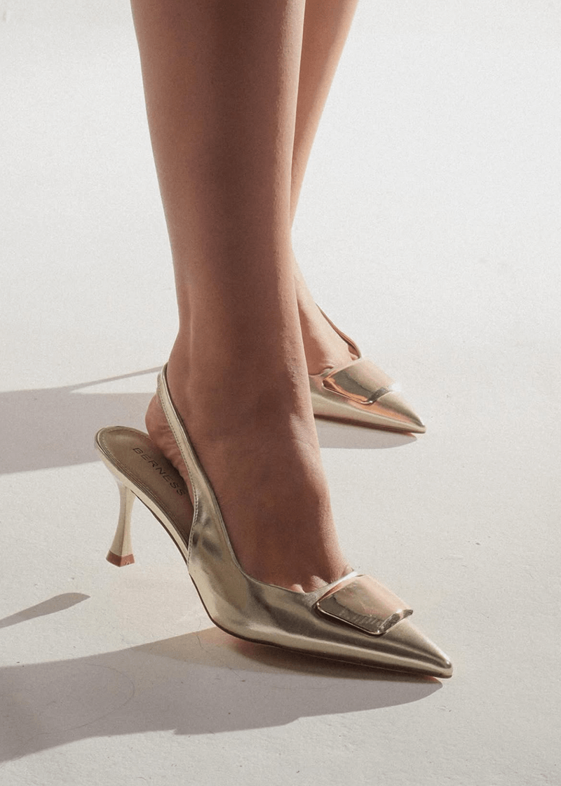 Zapato destalonado de tacón fino tipo slingback. Capellada en material suave tipo ante en color nude. Diseño de punta fina con detalle de lazo decorativo. Tira trasera con ajuste elástico